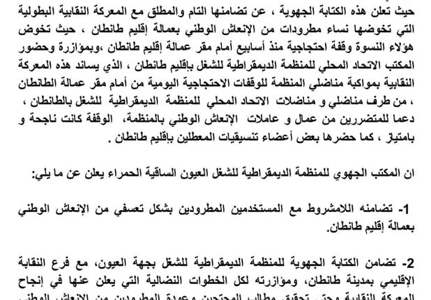 أصدرت الكتابـة الجهويـة للمنظمـة الديمقراطيـة للشغـل بـجهة العيـون الساقيـة الحمـراء بيانـا تضامنيـا مسانـدا لنـضالات الاتحـاد المحلـي للمنظمـة بالطنطـان بخصـوص ملحمـة اعتصـام عاملات وعمال الإنعاش الوطني.