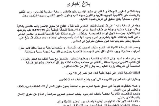 وجه المنتدى المغربي للمواطنة و الدفاع عن حقوق الإنسان بإقليم طانطان ، رسالة مفتوحة لكل من : وزير التعليم والرياضة، مدير الأكاديمية الجهوية للتربية والتكوين بجهة كلميم وادنون، المدير الإقليمي بمديرية طانطان، رجال الإعلام ، للمطالبة بفتح تحقيق في تعرض تلميذة للتعنيف.