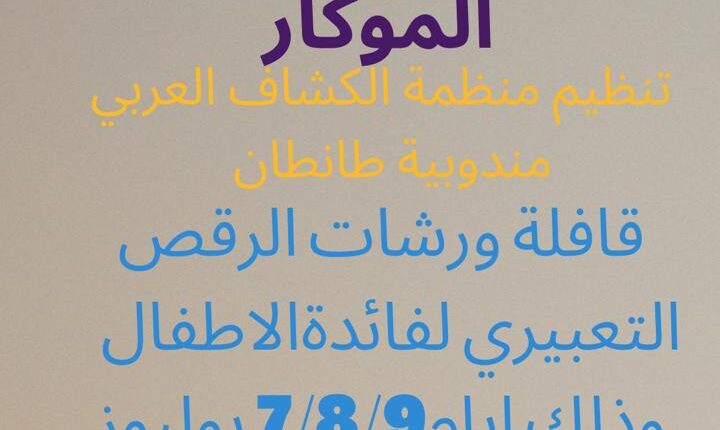 بدعم من مؤسسة الموكار تنظم منظمة الكشاف العربي مندوبية طانطان قافلة ورشات الرقص التعبيري لفائدة الأطفال، وذلك أيام 7/ 8 / 9 يوليوز 2023، بكل من دار الشباب المسيرة و دار الشباب بئرنزران و مركز العصبة المغربية لحماية الطفولة.