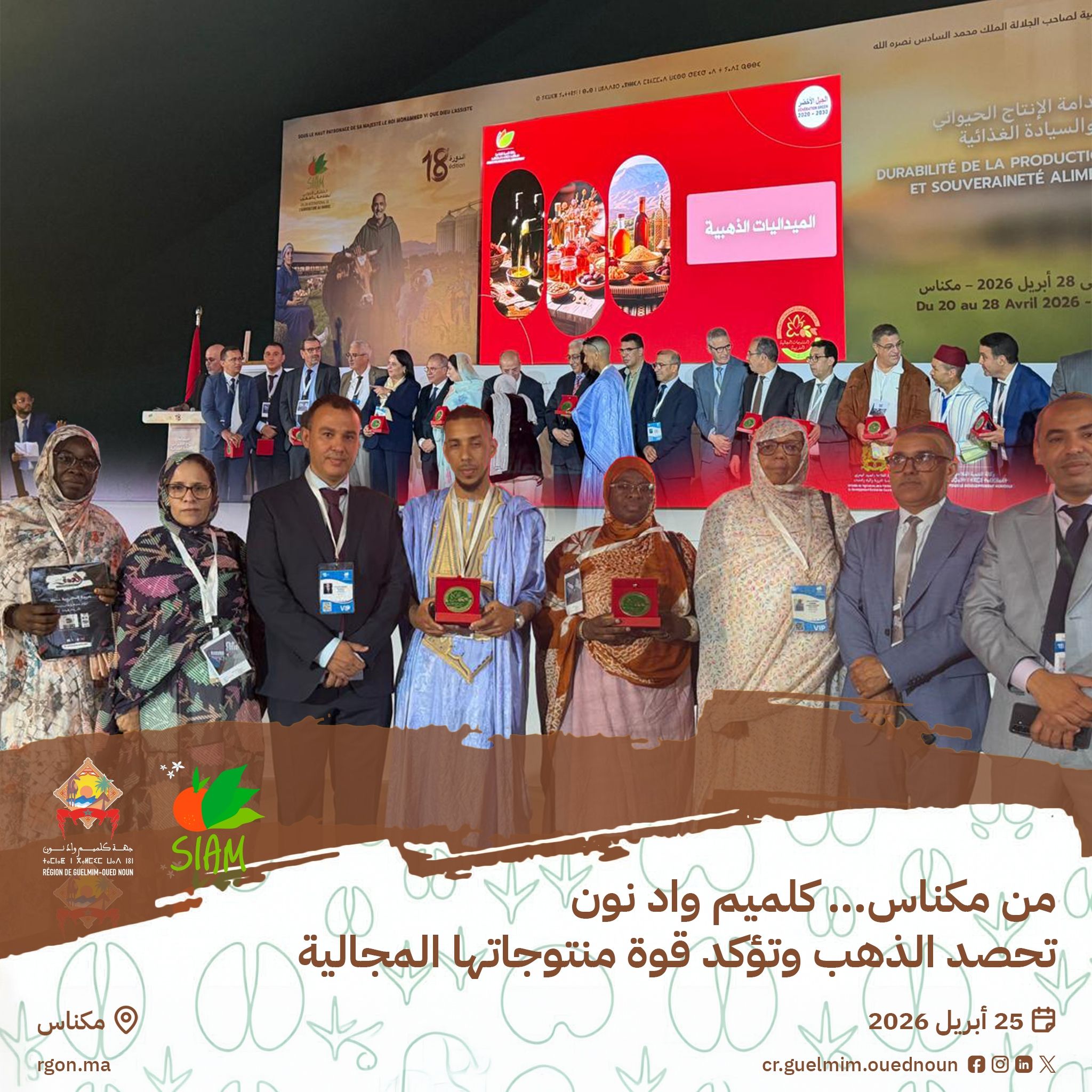 في سياق الدورة الثامنة عشرة للمعرض الدولي للفلاحة بمكناس، أكدت جهة كلميم واد نون حضورها القوي والوازن ضمن أبرز الفاعلين في مجال تثمين المنتجات المجالية، حيث بصمت على مشاركة متميزة تُوِّجت بإحراز تعاونيتين من نسيجها التعاوني للميدالية الذهبية، في إنجاز يعكس بوضوح مكانة الجهة كقطب صاعد في المشهد الفلاحي الوطني.